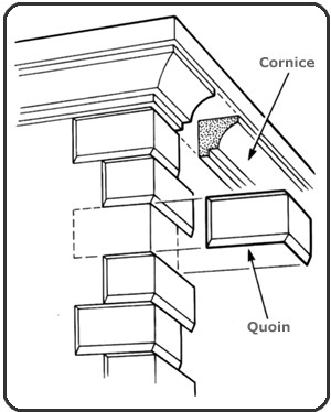 Ornamental Brick - A veneer of plaster cement mixture where colors may or may not be used to create different color schemes. Tooled and accented to simulate real brick.